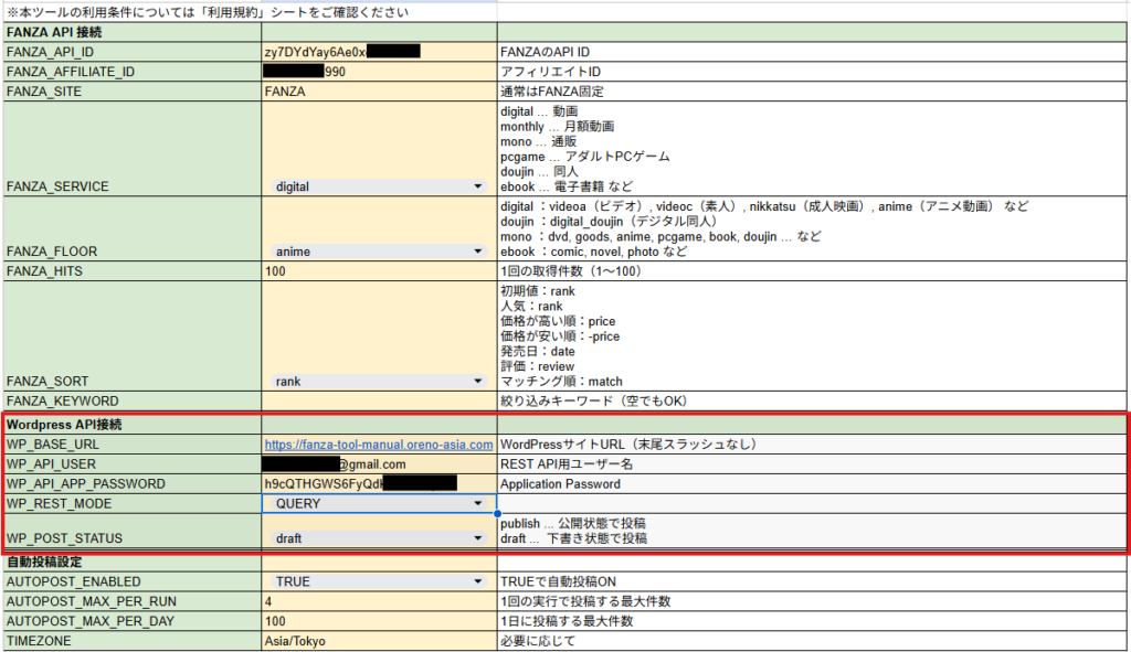 本ツールはこの情報を用いて、FANZAやWordpress に接続しますので正確に入力する必要があります。